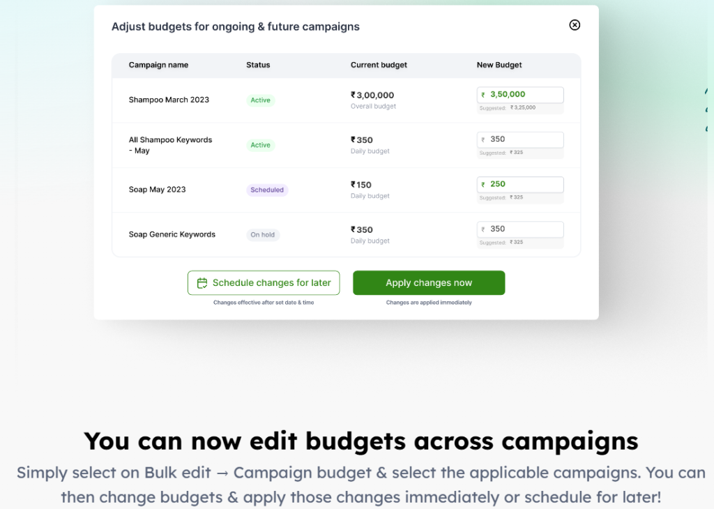 Bulk edit budgets instantly or schedule changes in advance—bringing flexibility to budget planning.