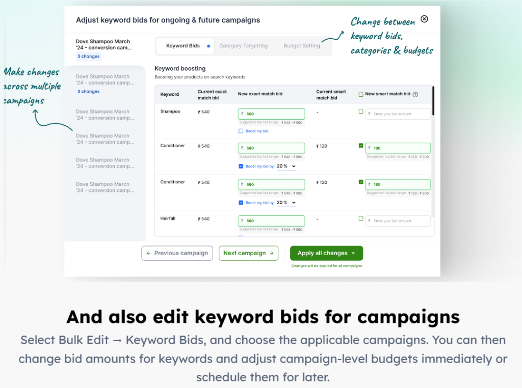 Adjust bids across multiple campaigns in one go, enabling faster optimization and testing.