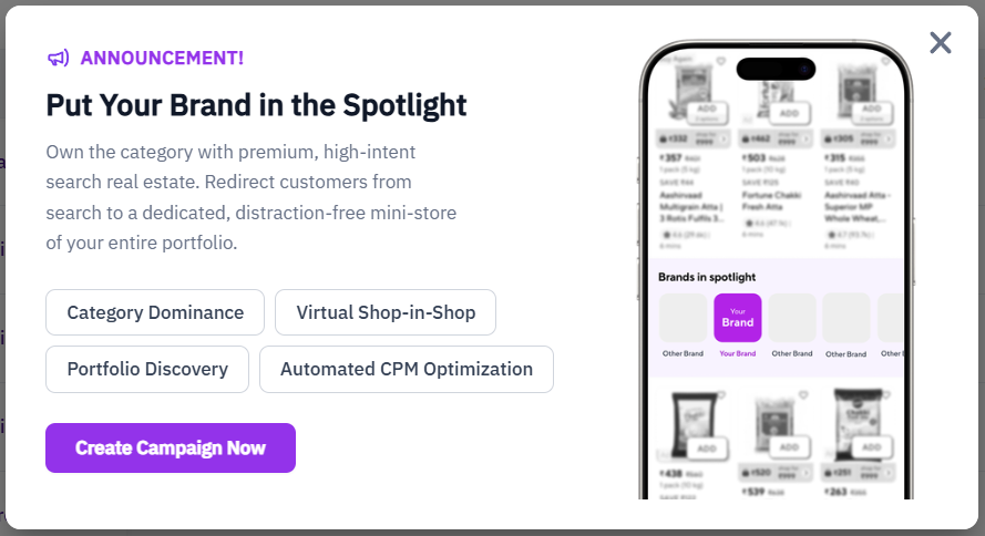 Brand in Spotlight is a premium ad format on Zepto that allows advertisers to secure top placements on the search page for targeted keywords.